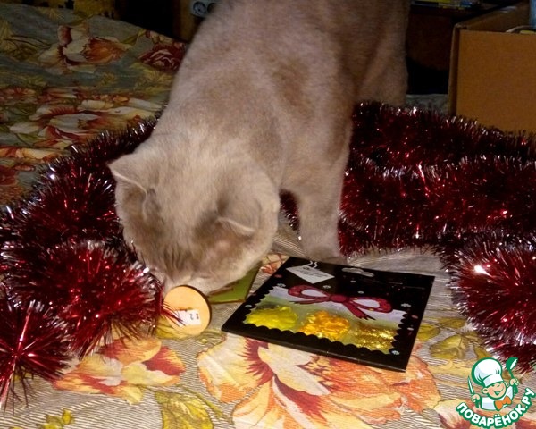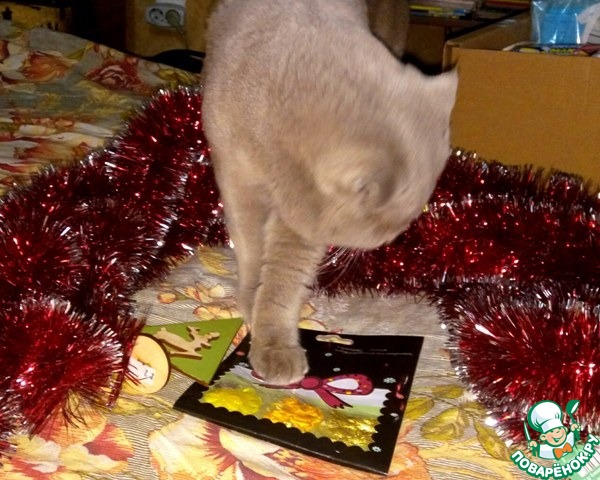 А тут Максим решил отвлечься от коробки и безучастного созерцания нашей суеты, облюбовал себе новогоднюю атрибутику - видимо, у кота тоже настроение предпраздничное