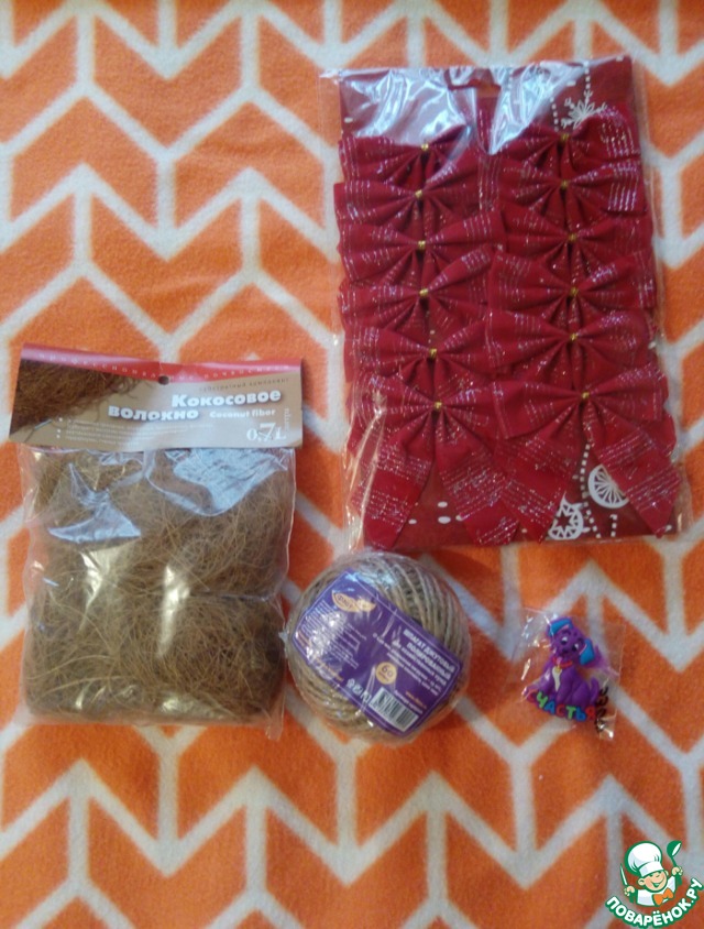 Красивучие банты на елку, кокосовое волокно, шпагат и магнит с собачкой