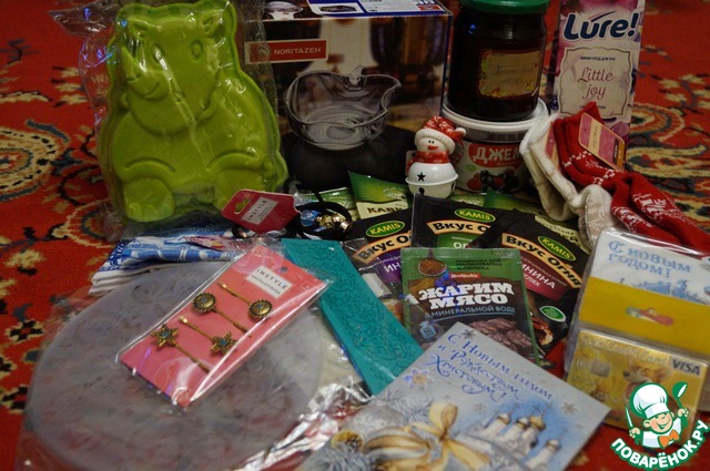 В моем большом подарке были: кухонное красивое полотенце, трафареты для сахарной пудры, набор различных специй и приправ, мягкие и пушистые новогодние носочки, резиночки и заколки для волос, крем для рук, новогодние салфетки, магнитик, салатник, силиконовая форма для выпечки, подвеска на ёлку, джем, а самое главное это варенье сваренное собственноручно Аленкой из крыжовника (кстати мое любимое!) В общем не подарок - а сплошной восторг! Спасибо моей снегурочке Аленушке за такой чудесный сюрприз и подарок!