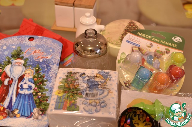 подарков так много, что я решила не фотографировать все вместе, а поделила на весьма условные группы (только штучка для приготовления роллов не попала в фото, так как чьи-то шаловливые ручки ее убрали в сторону!)