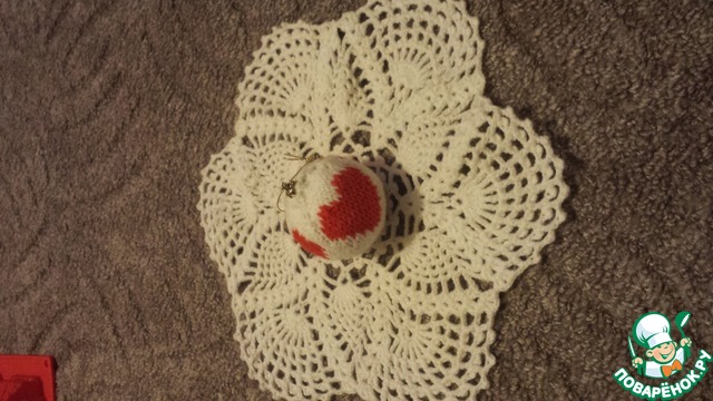 Ну и конечно же, Ниночка известная рукодельница-не могла нас не порадовать своими шикарными творениями!!! Вот такой новогодний шар для елочки!!! И нежная белоснежная салфетка-как снежинка!!! Такие подарки всегда дышат любовью и теплом)