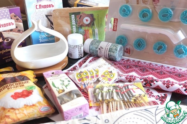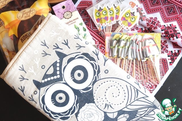 Симпатичный рушничок, хваточка с совушкой, шпажки для канапе, да и еще упаковка бумаги для профессиональной выпечки (она сбежала из кадра
