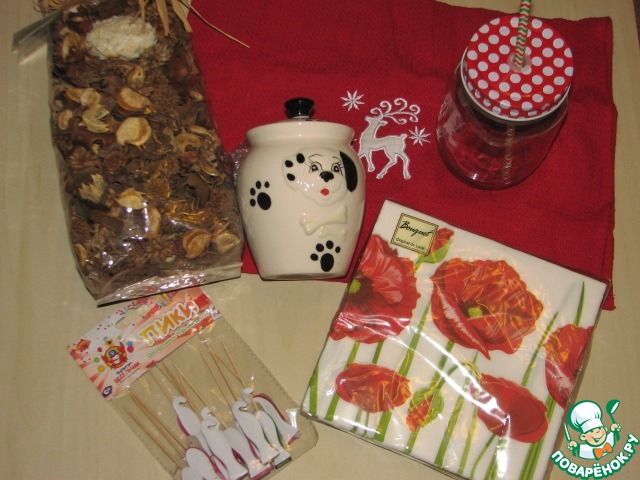 Посмотрите, какая миленькая сахарница с символом наступившего года, всегда нужные салфетки и шпажки для канапе. Замечательная баночка для коктейлей для фуд-фото, в которой пряталось красивое с красное полотенце, и ароматическая композиция.