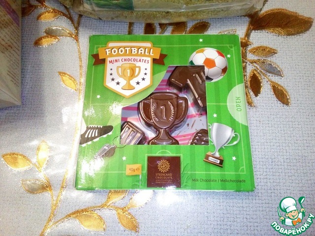 еще вкусняшки. среди них набор шоколадный для украшения тематического торта: кубок, медаль. мяч футбольный, даже бутса футбольная. правда. здорово?
