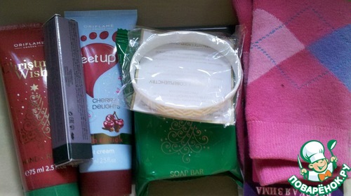 Подарки для красоты- крем для рук и ног, мыло, помада для губ, браслетик, пакетик и теплые носочки!