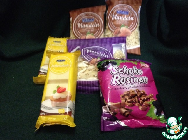 Белый шоколад для выпечки, рубленный миндаль и миндальные хлопья, изюм в шоколаде (если я правильно поняла)