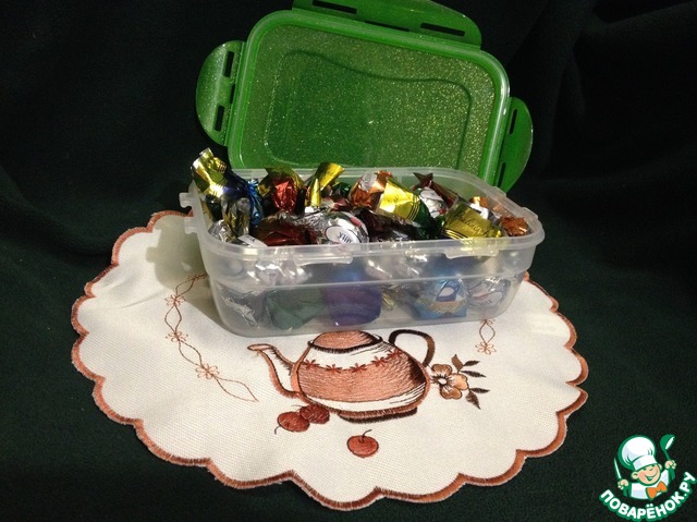 Сынуля получил в качестве подарка контейнер для обеда на работу (свой уделал, и как-то я написала Оленьке) и россыпь наших любимых конфет (то, что от них осталось я добросовестно сложила))))