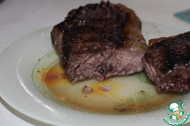 Мясо несколько потеряло в весе. Стало весить около 850 г. Так как зрело оно не особо долго. подсохшие участки срезать не стал, не так уж сильно они и подсохли. Только срезал кость. Получились два таких добрых стейка толщиной примерно 2.5 см. Общий вес около 650 г.