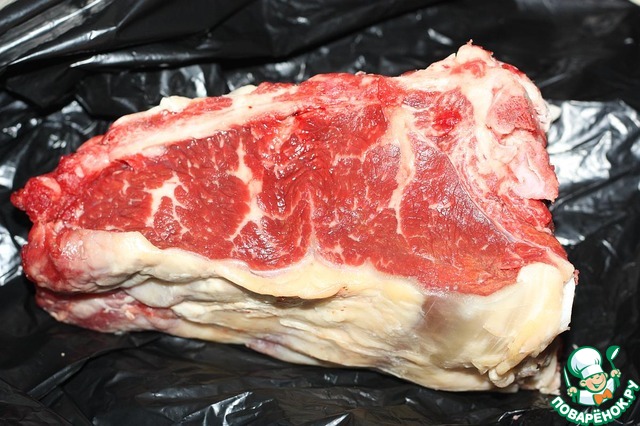 Итак у меня был кусок стриплойна с костью около 950 г. Напомню, что покупал я его по 350 р. за кг.
