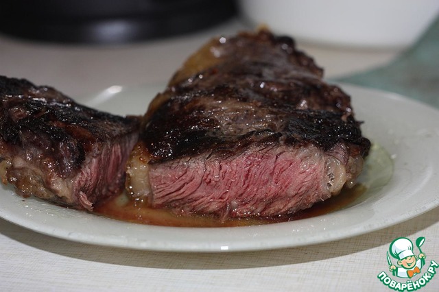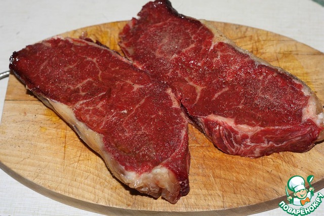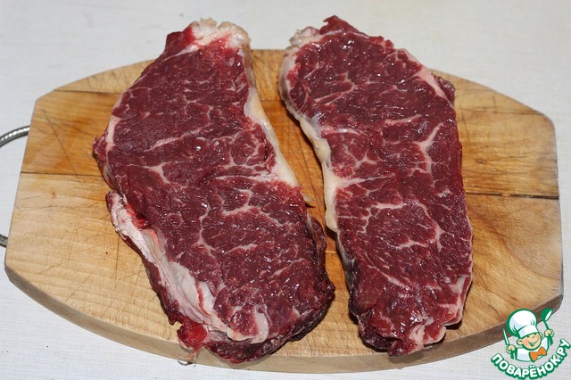 Мясо несколько потеряло в весе. Стало весить около 850 г. Так как зрело оно не особо долго. подсохшие участки срезать не стал, не так уж сильно они и подсохли. Только срезал кость. Получились два таких добрых стейка толщиной примерно 2.5 см. Общий вес около 650 г.