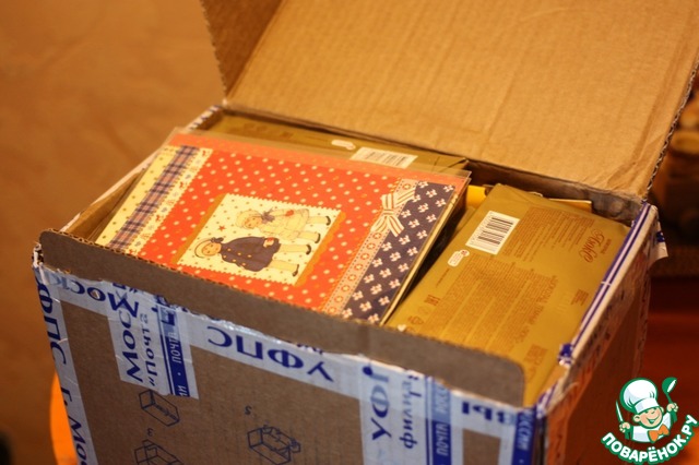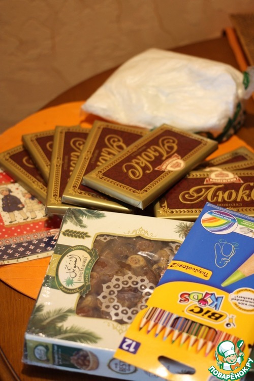 А ещё большое количество шоколада, финики, кокосовая стружка, для Илюшки-карандашики, коробочка для свечек и очень милая открытка