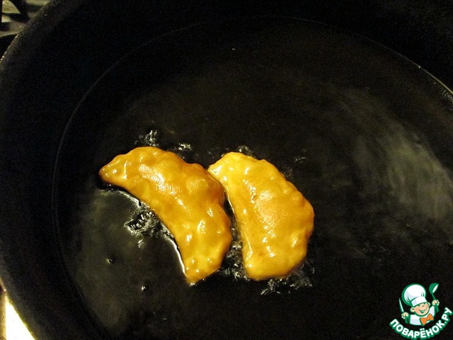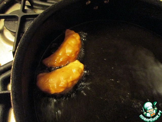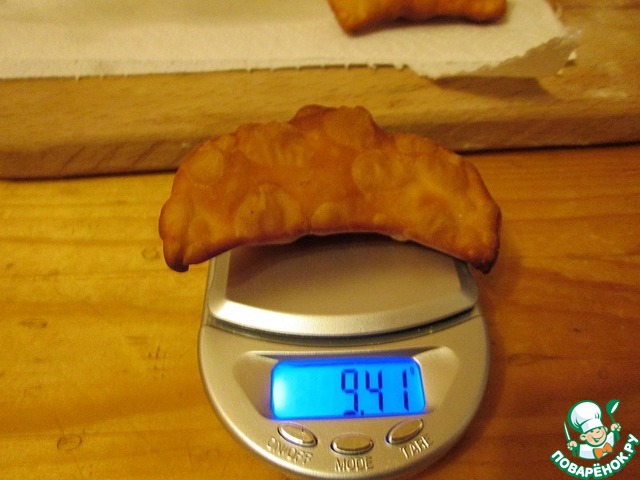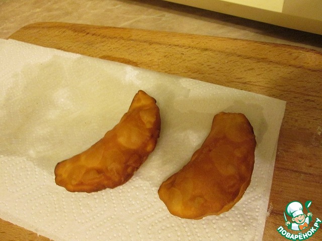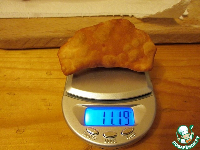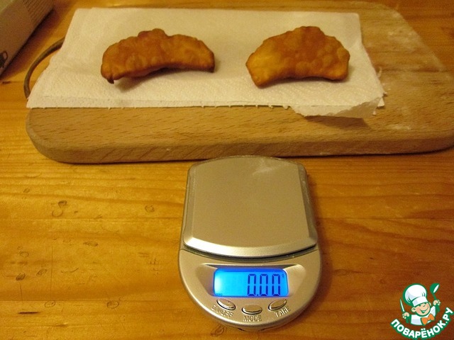 И жарим. Сразу видно на глаз, что тесто с водкой лучше жарится, пузырится, что для чебуреков очень важно. С острыми концами это с водкой.