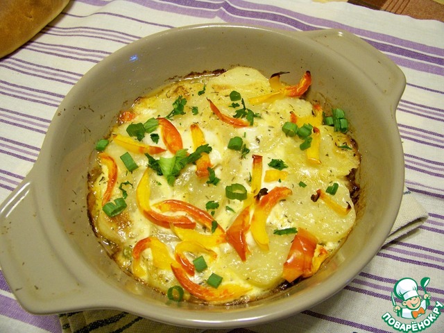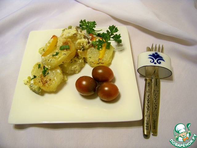 Запеченный картофель с маринованными огурцами и с горошком