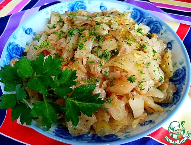 Блюдо - мечта, для любителей тушеной капусты! Очень-очень вкусная, ароматная, сочная! Обжаренный лучок дополняет вкус! Готовила в огнеупорной форме, накрыв фольгой, пару раз перемешивала.