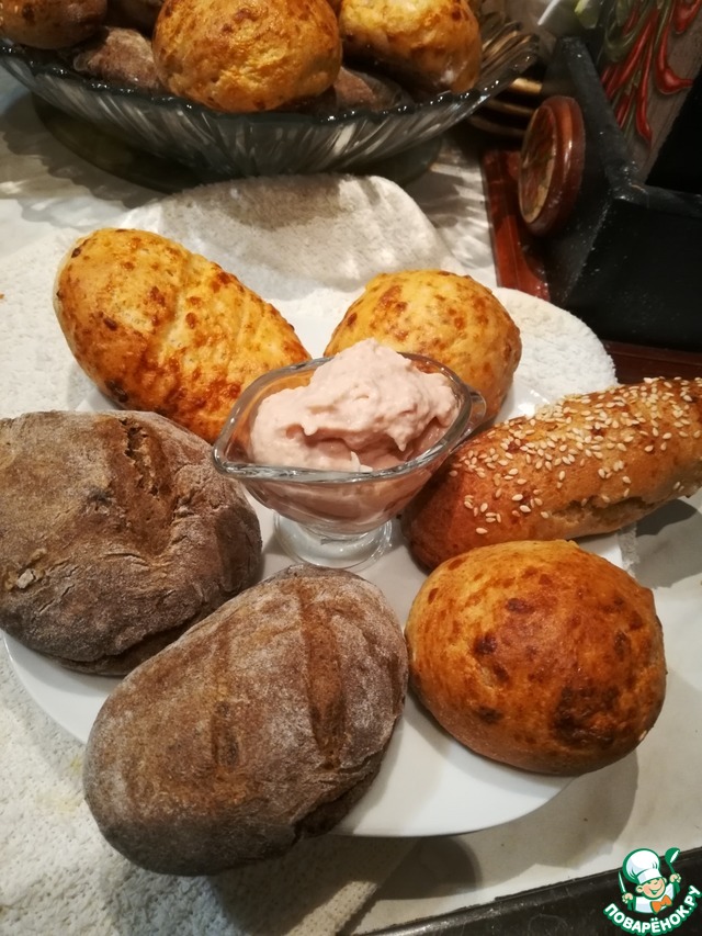 Хлебная корзинка "Хлеб-всему голова" Собираем нашу корзинку. По 1 штуке булочек каждого вида собраем на 1 тарелку, если будете подавать с намазками, риетом или чем-то еще, значит добавляем это "что-то" на тарелку