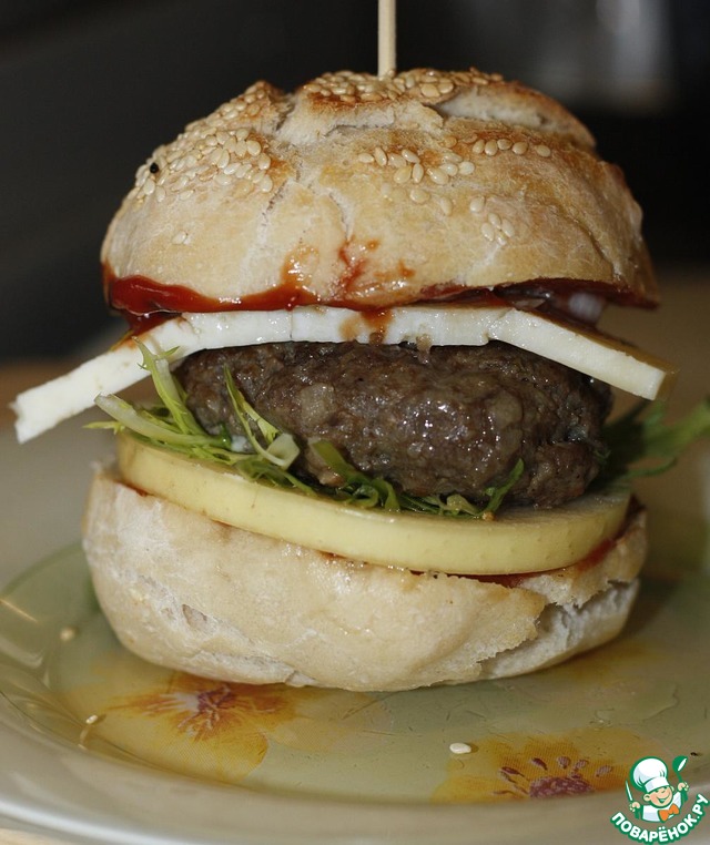 Вот бургер. Булочки испек из хлебного теста и они слегка треснули.