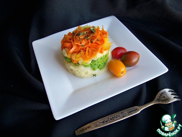 Пюрировала картофель и горошек отдельно. Все приготовленные овощи слоями выложила в сервировочное кольцо и получилась красота, которую быстро съели, получив удовольствие!