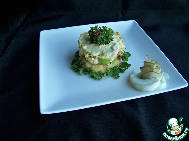 Очень простой в приготовлении, но очень вкусный салат! С моей стороны было небольшое изменение-добавила чуть-чуть вареного картофеля вместо сыра. Ну не любят мои мужчины сыр. Салат ушел на ура! Больше всех и громче всех УРА кричала я! Довольнаяяя! Спасибо, Машунечка!