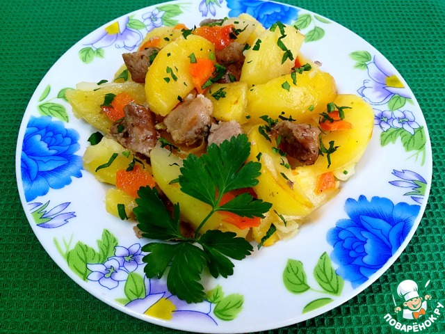 Картошка получилась такая ароматная, мясо нежное мягкое, очень вкусно! От себя для цвета и вкуса добавила лук с морковью, зеленью посыпала при подаче.