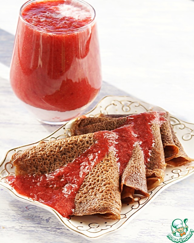 Просто восхитительные блинчики получились - с тонким вкусом шоколада, нежные, красивые. Делала и совсем тоненькие, и потолще - нам второй вариант больше понравился, сильнее чувствуется вкус шоколада. А с клубничным соусом - это просто божественный завтрак.
