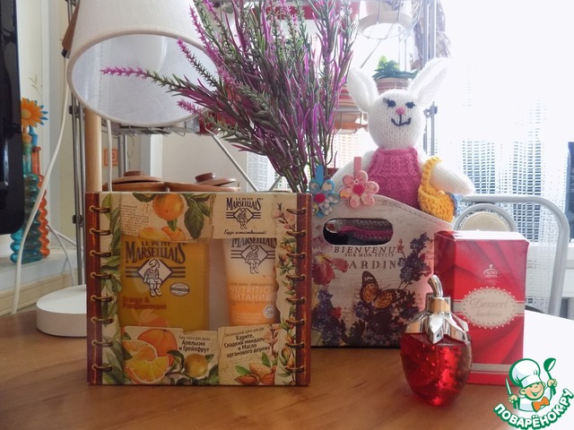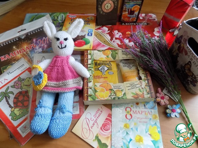Вот такая красота - ручной работы Зайка... Сумочка декоративная. Я её сразу приспособила под расчёстки на зеркало. Туалетная вода "Десерт Барбарис" и набор косметический, который состоит из пены для ванны и крема для рук, декоративная веточка лаванды, календарь Сочи, два набора для вышивки, набор для пасхальных яиц.