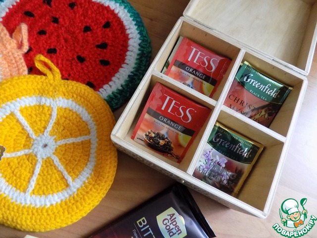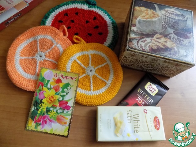 В отдельном пакете была замечательная декупажная коробочка для хранения чая, вязанные прихватки или подставки под горячее тоже ручной работы. Я так думаю, что это всё работа Наташи. Умничка!!! Там же лежал шоколад тёмный и белый. Люблю шоколадки.