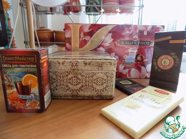 Это вид сладостей, кофе и набора для глинтвейна, коробка любимых конфет.