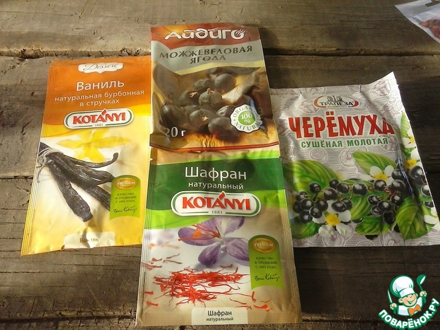 Невиданные в наших краях специи - шафран, можжевеловая ягода, черемуха молотая и ваниль ( которая уже использовалась для приготовления ванильного сахара)