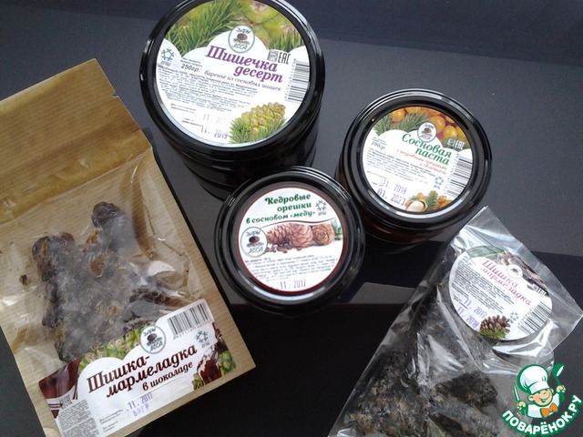 А таких вкусняшек я в жизни ещё не видела! Представляете, это сосновая паста с кедровыми орешками и облепихой, варенье из сосновых шишек, кедровые орешки в сосновом меду! шишки-мармеладки!!!