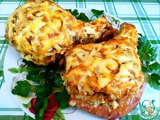 Мясо у меня на косточке, лука взяла много. Запекала одним слоем до красивого золотистого цвета. Лучок запечённый с приятной сладостью, мясо очень нежное, сочное, мягкое, хоть губами ешь! Вкусно!!! Подавала с соусом и картофельно-капустным гарниром. Обед у нас праздничный получился, вкусно накормила свою семью.))