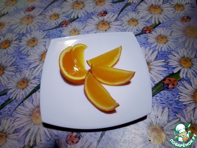 Правда я сделала его только из сока апельсинов)) Поясню почему) Рецепт так заинтересовал меня, что мне скорее хотелось попробовать приготовить и конечно же попробовать эту красоту. А на кухне, к моему счастью, лежал один целый апельсин в кожуре))) И та-да-дам! Понеслось... И вот уже десерт застыл в холодильнике и проба снята)) Рекомендую и советую! Очень вкусный десерт получился, от кожуры желе не отпадает) а разрезается красивыми дольками! Это вкусно! Это красиво!