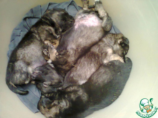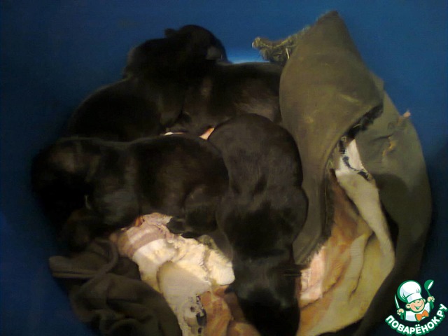 И вот, прибежав домой, я понимала, что первым делом их надо согреть! Набрала в мисочку теплую водичку и выкупала щенят с детским мылом. В теплой воде трое из щенков начали оживать, а четвертый был практически бездыханным... Сдаваться я не собиралась! Говорю ему: "Ты будишь жить!" Закутала их в старое полотенце и положила себе под свитер. Это быстро помогло им согреться, просохнуть и О, ЧУДО! самый слабенький щеночек победил смерть! Стал двигать лапками и пищать. Это оказалась девочка и я сразу дала ей кличку Победа (в знак победы на смертью). Согрееелись! Надо бы и покушать уже)))... И понеслось - бутылочки, соски, подбор молочной смеси для питания (у щенков, как и у деток реакция на неподходящий состав, то животик болит, то колики, то рвота, то понос...). А дальше смена подстилочек в тазу, купание, согревание, кормление каждые три часа!... Так я стала многодетной щенячьей мамой)))!