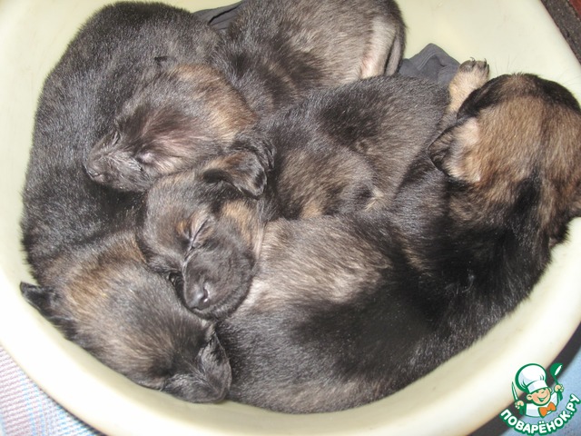 На 11-ый день у одного пузатика открылись глазки, а на следующий день у остальных и теперь мимо них не возможно проскользнуть не заметно! Дошло дело до подбора кличек. Каждый получил кличку в соответствии со своей особенностью. Одну девочку за волю к жизни я назвала Победой, вторую назвала Пулькой за то, что она очень уж шустрая и все время вываливалась из тазика). Один мальчик был самый крупный и с белой грудкой, как у гималайского медвежонка, он получил кличку Гималай. Второй мальчик раньше всех начал гавкать, ну, прям герой, вот Героем и назвала его. Так и зажили дружной, веселой, щенячьей семейкой Пулька, Победа, Гималай и Герой!