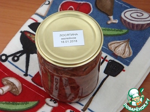 И все эти сокровища мне прислала Леночка lelika. Поняла я это, развернув красивое, мягенькое кухонное полотенце, в которое была завернута... банка. Это настоящий деликатес - Желейное из лосятины, приготовленное ручками Леночки. Кстати, все и началось с рассказа Леночки о своих заготовках разного вида мяса и рыбы. Я искренне восхитилась, на что сразу получила предложение Леночки прислать баночку на пробу. Честно сказать, было очень неудобно, и я постеснялась дать свой адрес. Но... Леночка нашла его. И вот я стала обладательницей просто чудесной заготовки. Пока пробу мы не снимали. Хочу родителей угостить. Но уверена, что это потрясающе вкусно.