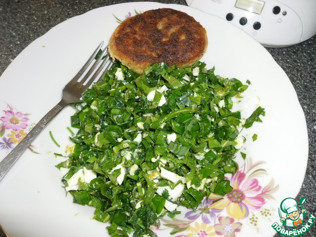 На пригретом бугорке в огороде вылезла молодая, тёмно зелёная крапива и кустики одуванчиков. На кустах смородины появились ярко зелёные листочки. На грядках ( закрытых на зиму соломой ) прорезался сквозь солому молодой чеснок, лук и петрушка. Этой зелени мне достаточно чтобы приготовить вкусный и полезный салат.