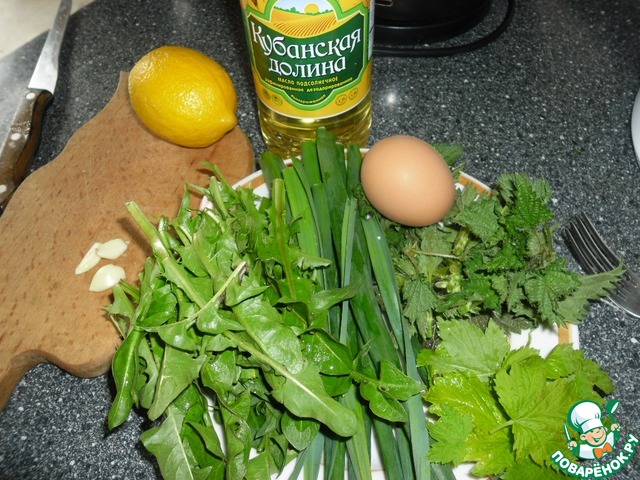 На пригретом бугорке в огороде вылезла молодая, тёмно зелёная крапива и кустики одуванчиков. На кустах смородины появились ярко зелёные листочки. На грядках ( закрытых на зиму соломой ) прорезался сквозь солому молодой чеснок, лук и петрушка. Этой зелени мне достаточно чтобы приготовить вкусный и полезный салат.