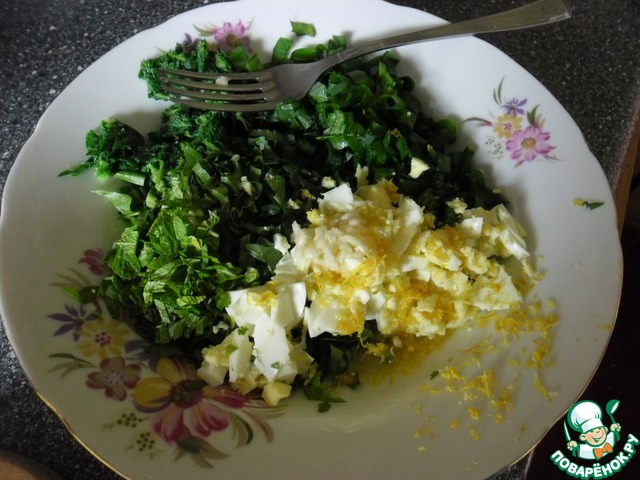 Теперь мелко нарезаю всю зелень в тарелку, добавляю рубленное яйцо и натираю немного цедры лимона.