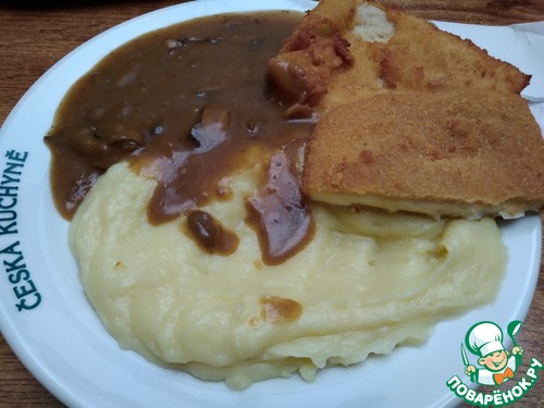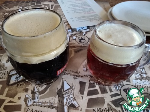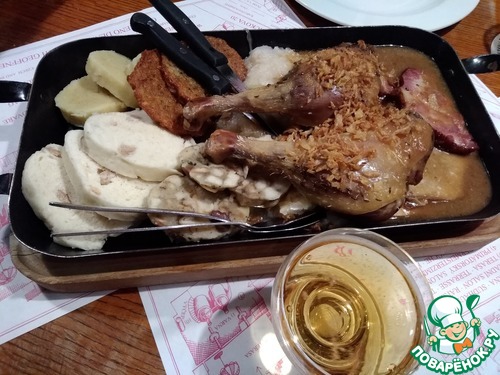 Это в заведении "Новоместский пивовар". Очень колоритное место. "Сельское угощение" наивкуснейшее: утиные ножки, запеченная свинина и говядина, котлетки, напоминающие драники и кнедлики, все с подливочкой. Вкусно невозможно!!! И невозможно осилить даже на двоих после целого дня на свежем воздухе)) Вкусное пиво. Можно заказать "набор" из 4 видов в маленьких стаканах на пробу. Маленькие стаканы это по 200мл. Ну, а потом (надегустировавшись) остановиться на более крупных формах)