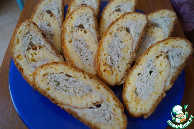 Очень необычный и интересный рецепт. Торт очень сытный! Использовала вместо мяса, пастрому из курицы. Я бы сказала - мужская еда!
