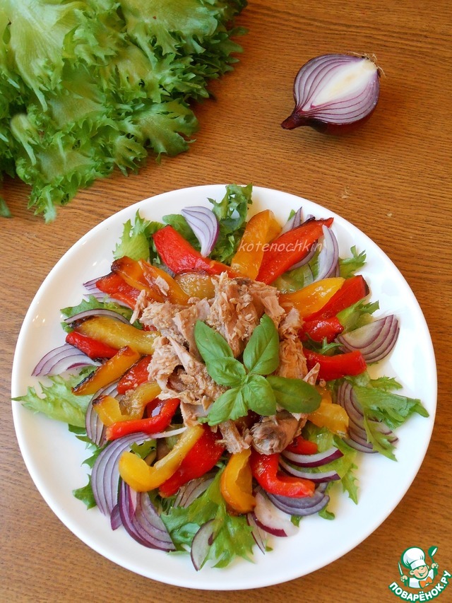 Просто обожаю печеный болгарский перец! И салаты с тунцом))) Поэтому и не сомневалась, что этот рецепт мне понравится. Очень вкусно! Вместо айсберга у меня фриллис, он тоже достаточно хрустящий.