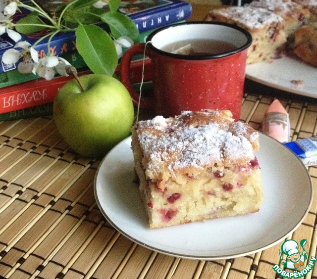 Это уже гораздо ближе к точному выполнению задания! Подобрать к зеленому яблоку красный продукт сложно, но эту задачу на себя взяла кружка. И в самом пироге вкрапления ягоды очень в тему.