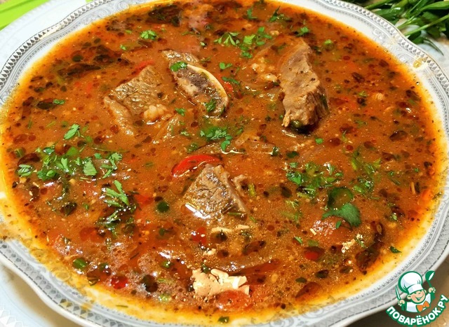 Харчо. Нуу, это уж мы знаем. Суп из говядины с рисом и грецкими орехами Суп очень пряный, острый, с обилием чеснока и зелени и намного гуще, чем прочие супы, к которым применяется правило «в супе должно быть половина жидкости». А вот вкус разочаровал, я иной раз вкуснее намного варю. Эээ, так муж сказал.