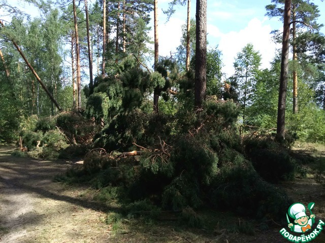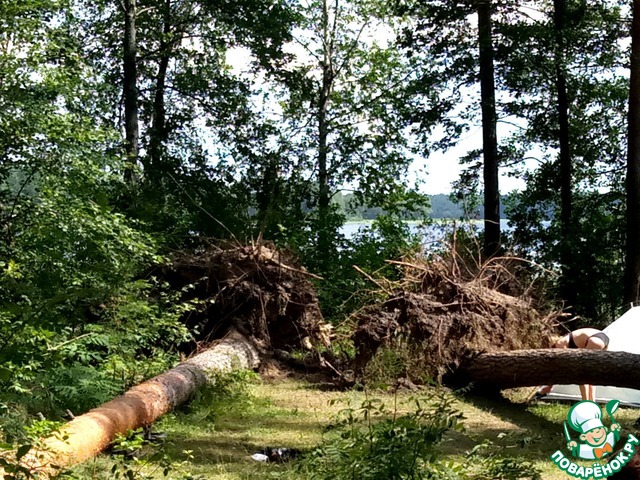 Две недели назад прошёл ураган и выкорчевал огромные сосны с одной стороны озера.