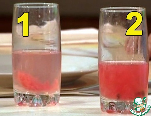 Простой тест по проверке арбуза на содержание в нём нитратов выглядит следующим образом: разрежьте плод, достаньте кусочек мякоти и опустите в теплую кипяченую воду. Нитратный арбуз через какое-то время окрасит воду в красный цвет (2), в то время как натуральный лишь слегка придаст воде розовый оттенок (1).