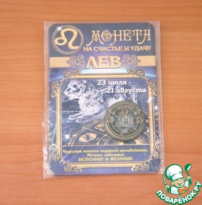 Талисман на счастье и удачу - Монета "Лев"на красочной открытке, внутри которой находится информация о совместимости с другими знаками Зодиака, о счастливых днях и числах, имена выдающихся Львов.