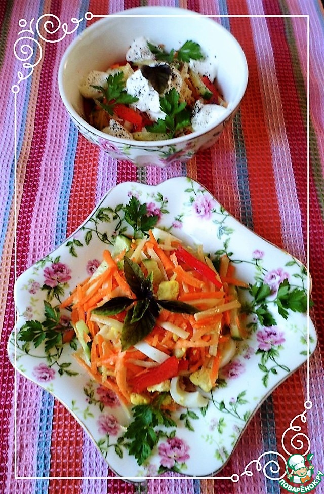 Великолепный салатик получился! Яркий, сочный и очень вкусный! Делала и с маслом, и со сметаной, понравились оба варианта! Спасибо, Танечка, за очень вкусный рецепт!