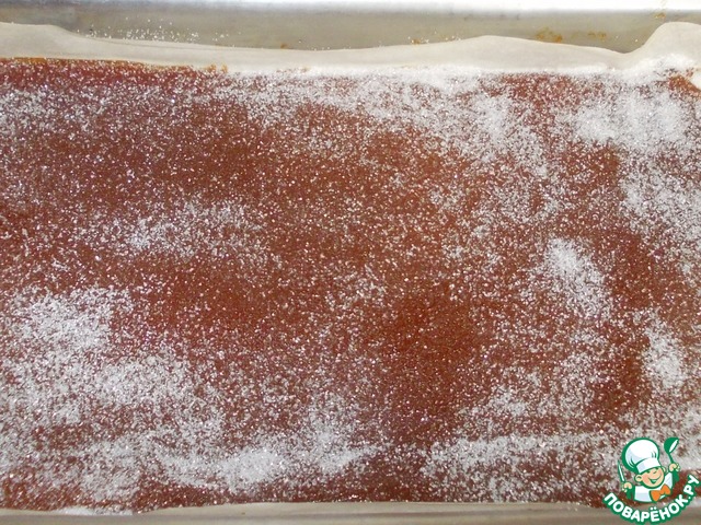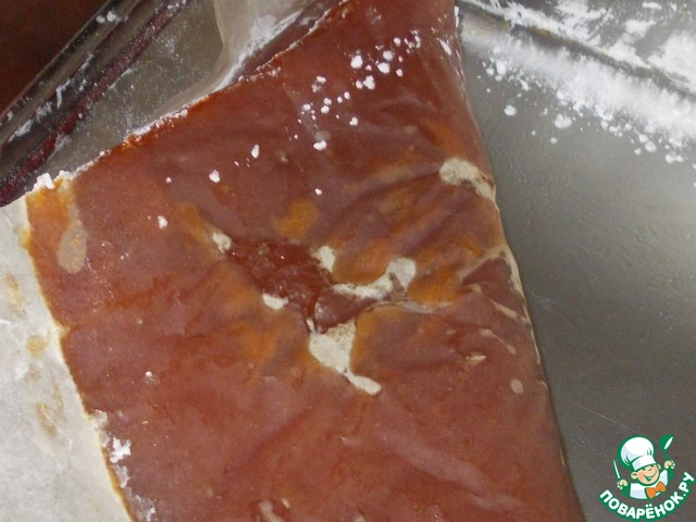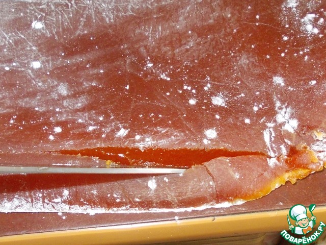 Не теряя веры и надежды, получить максимально приближенное к мармеладу лакомство, я решаю перевернуть слой повидла нижней стороной вверх! Переворачиваю повидло на стол, снимаю пленку.