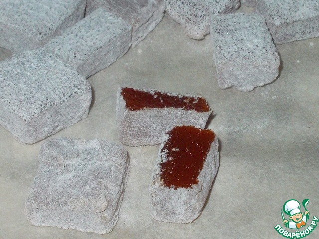 Дорогие друзья, вещь вкусная получается, но скорее похожа на рахат лукум нежели на мармелад! Вот эти квадратики сохнут теперь еще несколько дней (3-4дня... уже сбилась с счета)... За эти дни еще дважды купала их в посыпке, так как нижняя сторона влажнела и прилипала! Дольше недели не планирую их вот так сушить! Уже подготовила коробочку куда сложу сие творение)))!