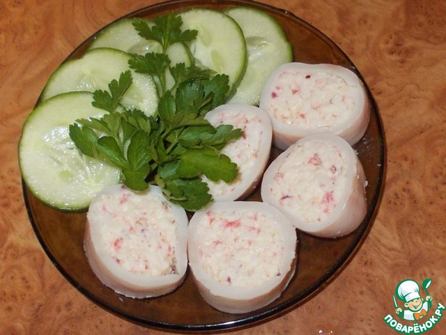А теперь немного о кальмарах... Сказать, что я их люблю - это ничего не сказать!! Я их обожаю!! И конечно, учитывая мою любовь, не смогла пройти мимо рецепта "Фаршированный кальмар" от поваренка balgyr. Кальмар очень вкусный в сочетании с такой начинкой!