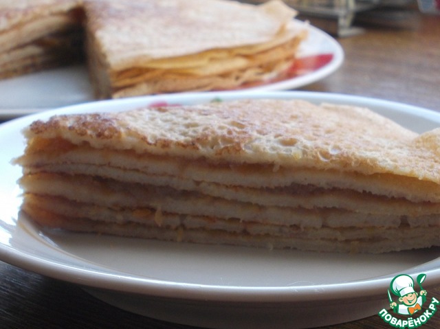 Следующее блинное блюдо "Блинный пирог с карамельными яблоками" от поваренка Okoolina. Очень вкусное сочетание блинов и яблок!! При случае сделаю украсив!!